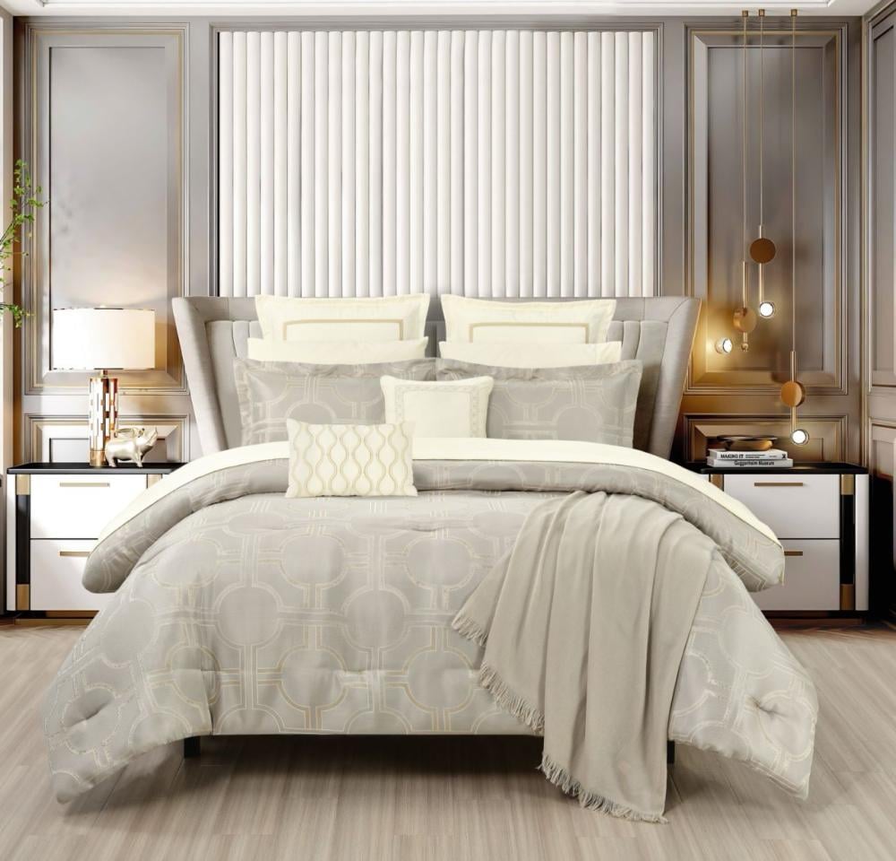 طقم جاكار فاخر للسرير المزدوج الملكي، يتألف من 12 قطعة بما فيها لحاف بحشوة ثابتة، ليناسب كل فصول السنة. يتميز بتفاصيله الأنيقة التي تضيف لمسة من الفخامة إلى غرفة نومك.